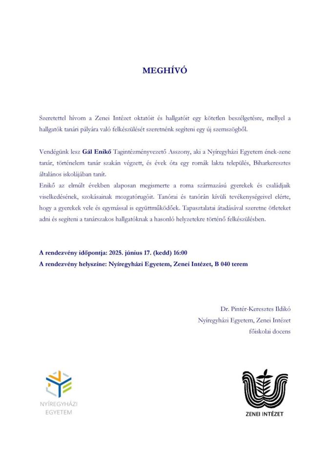 Szeretettel hívom a Zenei Intézet oktatóit és hallgatóit egy kötetlen beszélgetésre, mellyel a hallgatók tanári pályára való felkészülését szeretnénk segíteni egy új szemszögből.